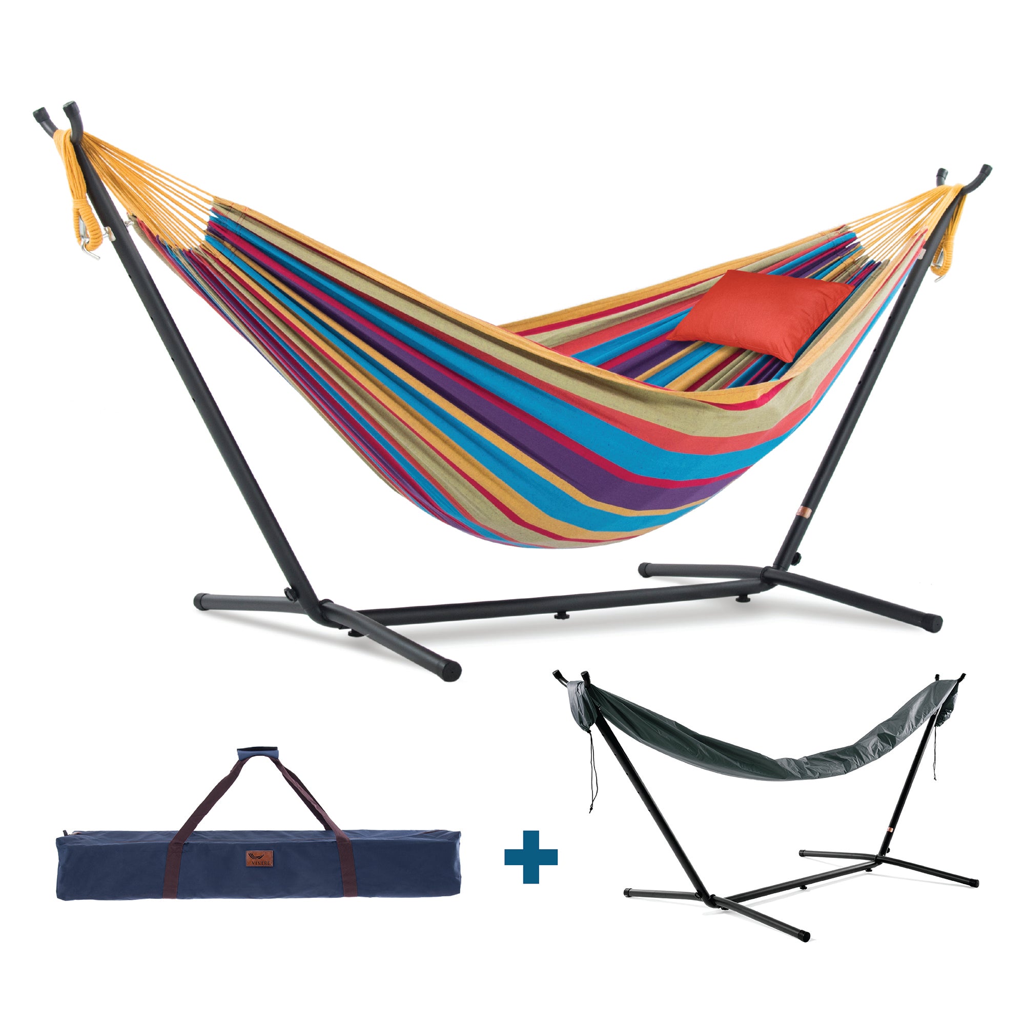 Comprend : hamac double en coton, oreiller, housse de hamac, support en acier et sac de transport
